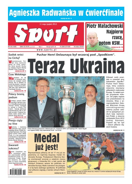 Teraz Ukraina – puchar Henri Delaunaya był wczoraj pod „Spodkiem”; Agnieszka Radwańska w ćwierćfinale; „Najpierw rzucę, potem KSW” – Piotr Małachowski; medal już jest – reprezentacja piłkarzy do lat 17 ma już zapewniony co najmniej brązowy medal mistrzostw Europy; czy Sadlok wróci na Cichą – wicemistrzowie Polski chcą wzmocnić skład na nowy sezon, na liście życzeń Ruchu są między innymi Maciej Sadlok i Piotr Ćwielong; czas Wolskiego – ma dopiero 19 lat i w drużynie narodowej nie rozegrał nawet minuty, ale to właśnie on może się okazać „czarnym koniem” finałów Euro 2012; Daniel Castellani ma w przyszłym sezonie poprowadzić ZAKSĘ Kędzierzyn-Koźle do mistrzostwa Polski.