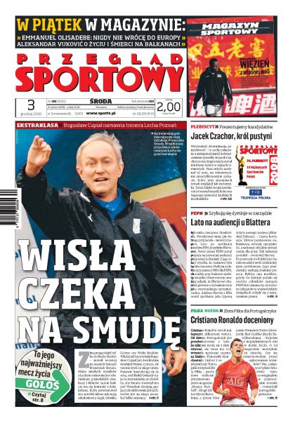 Akcje Franciszka Smudy stoją najwyżej na trenerskiej giełdzie, właściciel Wisły chciałby widzieć go u siebie; tylko pieniądz może zbawić naszą piłkę - wywiad z Jackiem Masiotą, członkiem zarządu PZPN; szef FIFA przyjął wczoraj Grzegorza Latę; były trener GKS Bełchatów zapowiada walkę o należne mu pieniądze; mecz życia - piłkarz Wisły Konrad Gołoś wytrwale walczy z boreliozą; Christiano Ronaldo najlepszym piłkarzem świata; dziś Tomasz Sikora rozpoczyna sezon biegiem na 20 km; czy Ammann utrzyma na dłużej formę z Kuusamo; wywiad z Pawłem Korzeniowskim.