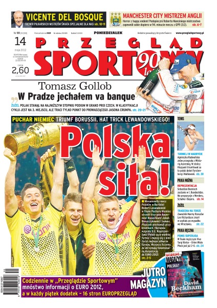 Manchester City mistrzem Anglii; Tomasz Gollob zajął trzecie miejsce w Grand Prix Czech; Agnieszka Radwańska znów przegrała z Wiktorią Azarenką; zawodnik Marmy Rzeszów, Lee Richardson, zmarł w szpitalu po wypadku na torze żużlowym we Wrocławiu.