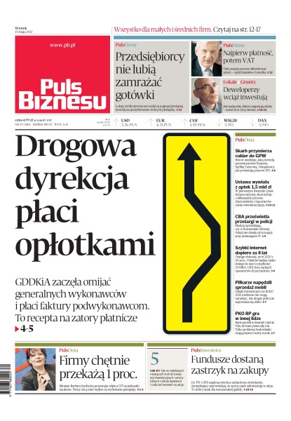 Lokaty krótkoterminowe nadal są najpopularniejszą metodą na spożytkowanie wolnych pieniędzy; GDDKiA zaczęła omijać generalnych wykonawców i płaci faktury podwykonawcom – to recepta na zatory płatnicze; w pierwszym kwartale rynek farmaceutyczny skurczył się o kilkanaście procent; CBA sprawdza, czy w Komendzie Głównej Policji nie doszło do korupcji przy przetargach IT.