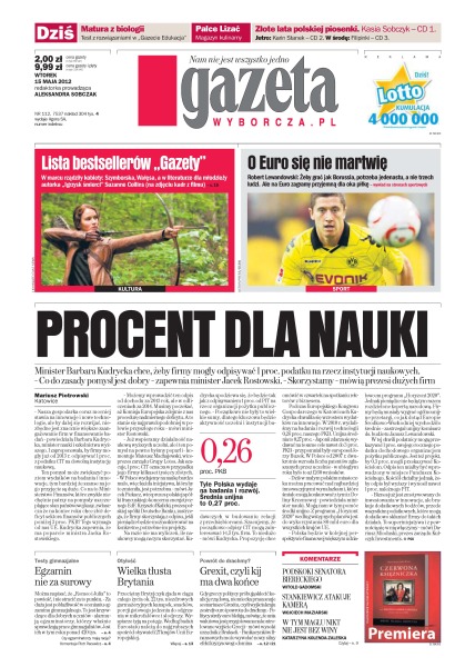 Minister Barbara Kudrycka chce, żeby firmy mogły odpisywać 1% podatku na rzecz instytucji naukowych; Francois Hollande dziś zostanie zaprzysiężony na prezydenta Francji; w nalotach NATO w Libii w ubiegłym roku zginęło co najmniej 72 cywilów – głównie kobiety i dzieci; WWF publikuje dziewiąty raport dotyczący kondycji środowiska naturalnego.