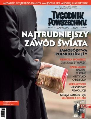 Temat Tygodnika: samobójstwa wśród księży; Cezary Michalski o najnowszym sporze Solidarności z rządem; 10 lat „Krytyki Politycznej” - rozmowa z Sławomirem Sierakowskim; Bartłomiej Sienkiewicz w sporze o nauczanie historii; pierwsza spowiedź: polemiki; Wojciech Pięciak o greckim kryzysie, Ryszard Petru o czarnych scenariuszach jego rozwoju; Paweł Leski o handlu śmiercią w Afryce; relacje z Międzynarodowego Festiwalu Historycznego „Wiek XX. Anamneses”; laureaci Medalu św Jerzego 2012; rozmowa z Jesperem Juulem na dzień samotnej matki; Piotr Kosiewski o Miesiącu Fotografii w Krakowie; Agnieszka Sabor o fotografiach Rodczenki; Tomasz Pindel o Carlosie Fuentesie; Natalia Sromek o akcji Althamera w Mińsku; dodatek historyczny poświęcony Konstantemu Wolnemu.