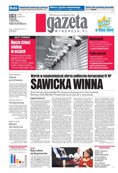 Beata Sawicka, posłanka PO oskarżona o przyjęcie łapówki, została skazana na 3 lata więzienia; z braku uczniów Gdańsk powinien zamknąć 25 szkół, ale władze miasta chcą je uratować; publiczne szpitale nie chcą leczyć VIP-ów podczas Euro 2012, bo UEFA żąda wiele, nic w zamian nie dając; przed międzynarodowym Trybunałem Karnym dla b. Jugosławii w Hadze odbył się wczoraj proces byłego dowódcy sił Serbów bośniackich, generała Ratko Mladicia.