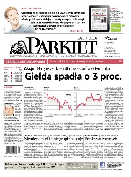 Giełda spadła o 3%; sprzedaż akcji Facebooka po 38 USD to największa pierwsza oferta publiczna w dziejach branży nowych technologii; ambitne plany zarządu Multimedia Polska.