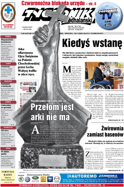 Arka ofiarowana Ojcu Świętemu na Polanie Chochołowskiej przez Lecha Wałęsę trafiła w obce ręce; mieszkańcy Dębna nie zgadzają się na budowę żwirowni – obawiają się, że odstraszy ona turystów; ratownicy TOPR 2 razy ewakuowali turystów, którzy utknęli w rejonie Orlej Perci; ks. kard. Franciszek Macharski obchodził kilka dni temu 85. urodziny – Podhalanie pojechali z życzeniami; Jan Wieczorkowski będzie negocjował z ministrem Skarbu Państwa wykup Uzdrowiska Rabka S.A.