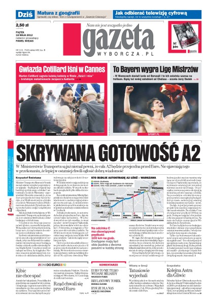 W Ministerstwie Transportu są już niemal pewni, że cała A2 będzie przejezdna przed Euro; trzy tygodnie przed Euro nie ma chętnych na prywatne mieszkania Polaków; po wyroku na b. posłankę PO Beatę Sawicką, część mediów i politycy PiS wzywają do przepraszania CBA; w nowym francuskim rządzie zasiadła połowa kobiet ministrów, ale do politycznej równości płci nad Sekwaną jeszcze daleko.