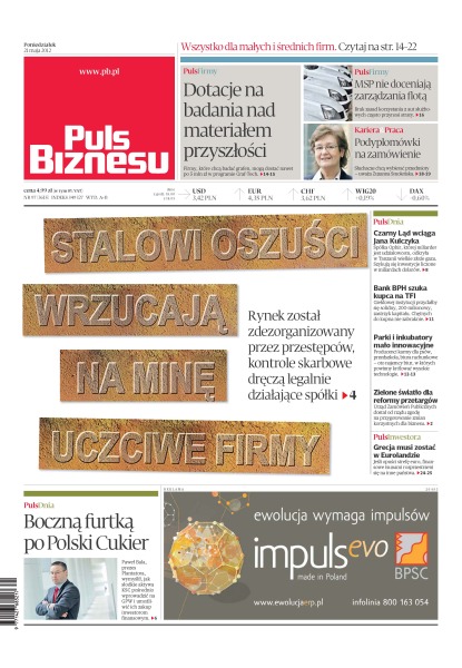 Rynek został zdezorganizowany przez przestępców, kontrole skarbowe dręczą legalnie działające spółki; Czarny Ląd wciąga Jana Kulczyka; Bank BPH szuka kupca na TFI; okazało się, że parki przemysłowe i inkubatory są mało innowacyjne; zielone światło dla reformy przetargów; dlaczego Grecja musi zostać w Eurolandzie; wszystko dla małych i średnich firm.