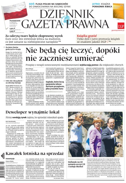 Przepisy o terapii nowoczesnymi medykamentami wykluczają pomoc dla większości chorych; za zakrytą twarz podczas Euro 2012 będzie ekspresowy wyrok; firmy sondują rynek najmu, bo sprzedaż mieszkań spada; Hollande na G8 ustawia szczyt UE i izoluje Merkel; list gończy jest nagminnie nadużywany przez sądy i prokuratorów; 8-proc. stawkę VAT może stosować organizator kolonii korzystający z własnego majątku.