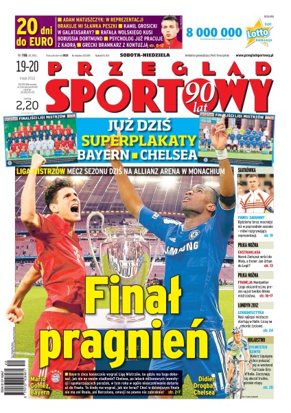 Już dziś wielki finał Ligi Mistrzów Bayern Monachium vs Chelsea Londyn – kto ma większe szanse na zwycięstwo; czy Marek Zieńczuk wróci do Wisły, a trener Jan Urban do Legii; nasi najlepsi miotacze startują w Halle i liczą na rekordy życiowe; Sylwester Szmyd, kolarz Liquigasu chce pokazać się w weekend na trasie Giro d'Italia.