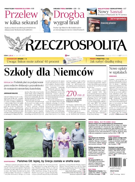 Podatnik płaci za podpisywanie przez rodziców deklaracji o przynależności do mniejszości niemieckiej i kaszubskiej; szpitale i przychodnie publiczne będą mogły tym samym sprzętem leczyć pacjentów za darmo i odpłatnie; banki na dniach umożliwią przedsiębiorcom dokonywanie błyskawicznych płatności; w Polsce wysyp nowych tras nastąpi dopiero po Euro 2012; puchar Ligi Mistrzów dla londyńczyków po emocjonującym meczu i rzutach karnych.