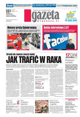 Rak piersi najdrożej leczony jest na biednym Podlasiu, najtaniej na zamożnym Śląsku, ale szansa na przeżycie jest identyczna; czego policja nauczyła się po sprawie Olewnika; prezes PiS Jarosław Kaczyński zapowiedział w weekend, że chce utworzyć województwo środkowopomorskie; stadiony to tylko wisienka na torcie, anie tort, a i one służyć nam będą nie tylko do rozgrywania meczów; za rok koniec operacji wojskowych w Afganistanie, Francuzi wychodzą już teraz – ustaliło NATO na szczycie w Chicago.