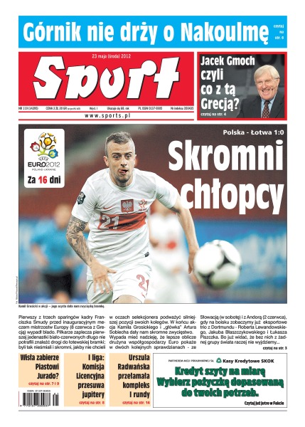 Pierwszy z trzech sparingów kadry Franciszka Smudy przed inauguracyjnym meczem mistrzostw Europy wypadł blado – Polacy pokonali Łotyszów 1:0; Los Angeles Lakers za burtą – nie pomogły 42 punkty Kobe Bryanta; rozmowa z Jackiem Gmochem.