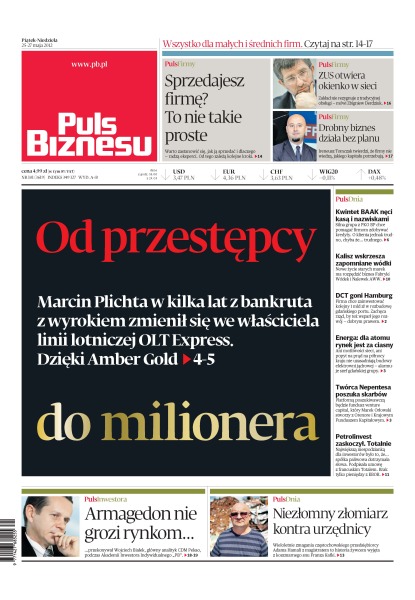 Marcin Plichta w kilka lat z bankruta z wyrokiem zmienił się we właściciela linii lotniczej OLT Express; sprzedajesz firmę – to nie takie proste; ZUS otwiera okienko w sieci; drobny biznes działa bez planu; kwintet BAAK nęci kasą i nazwiskami; Kalisz wskrzesza zapomniane wódki; twórca Nepentesa poszuka skarbów.