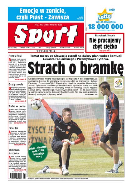 Przed meczem ze Słowacją strach o bramkę – kontuzje Łukasza Fabiańskiego i Przemysława Tytonia; emocje w zenicie, czyli mecz Piasta Gliwice z Zawiszą Bydgoszcz; rozmowa z Franciszkiem Smudą; Rosja, nasz grupowy rywal na Euro, zremisowała z Urugwajem, zaś Czechy i Grecja zmierzą się w sparingach dziś; Łukasz Trałka będzie grał w poznańskim Lechu; Agnieszka Radwańska awansowała do finału turnieju w Brukseli; Adam Kszczot, halowy mistrz Europy, wygrał wczoraj bieg na 800 metrów podczas mityngu w Ostrawie.