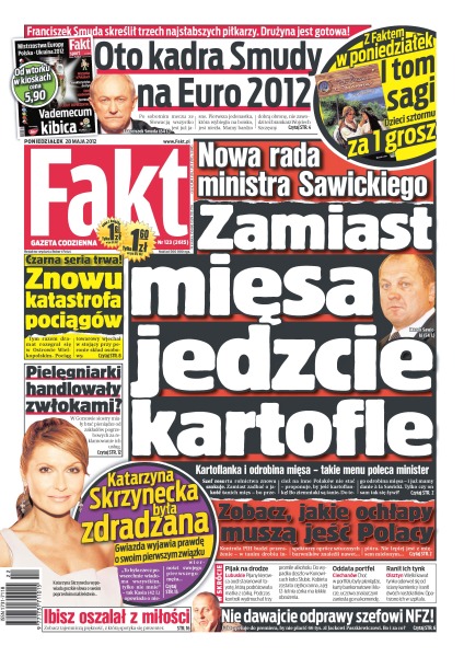 Nowa rada ministra Sawickiego – „Zamiast mięsa jedzcie kartofle” – kartoflanka i odrobina mięsa, takie menu poleca minister; zobacz jakie ochłapy muszą jeść Polacy; Katarzyna Skrzynecka była zdradzana – gwiazda wyjawia prawdę o swoim pierwszym związku; Krzysztof Ibisz oszalał z miłości – zobacz tajemniczą piękność, z którą spotyka się prezenter; nie dawajcie odprawy szefowi NFZ – Fakt apeluje do premiera, by nie płacić 66 tysięcy złotych Jackowi Paszkiewiczowi, bo i za co; pielęgniarki handlowały zwłokami – w Gorzowie siostry miały brać pieniądze od zakładów pogrzebowych za reklamowanie ich usług; czarna seria trwa – znowu katastrofa pociągów; Franciszek Smuda skreślił trzech najsłabszych piłkarzy – drużyna jest gotowa.