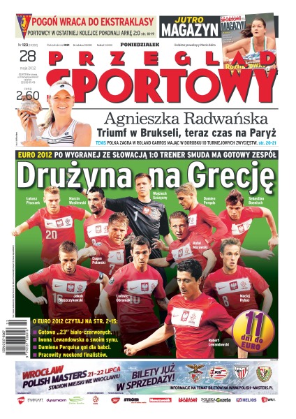 Drużyna na Grecję – po wygranej ze Słowacją 1-0 trener Smuda ma gotowy zespół; Iwona Lewandowska o swoim synu; Pogoń wraca do Ekstraklasy – Portowcy w ostatniej kolejce pokonali Arkę 2-0; Agnieszka Radwańska – triumf w Brukseli, teraz czas na Paryż – Polka zagra w Roland Garros mając w dorobku 10 turniejowych zwycięstw; Damien Perquis i jego gol dla babci; Łukasz Fabiański – największy pechowiec w polskiej kadrze; „Polacy mogą być w półfinale” – Tomasz Hajto szczerze o reprezentacji; złoto i rekord Polski – Radosław Kawęcki w efektownym stylu wygrał 200 m grzbietem na mistrzostwach Europy w Debreczynie.