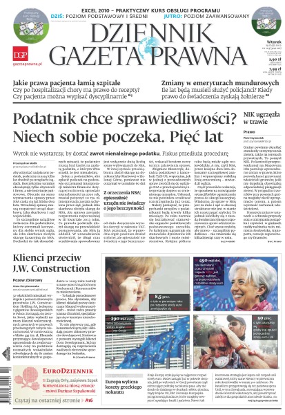 Gdy podatnik chce sprawiedliwości musi poczekać, pięć lat – wyrok nie wystarczy, by dostać zwrot nienależnego podatku, fiskus przedłuża procedurę; jakie prawa pacjenta łamią szpitale – czy po hospitalizacji chory ma prawo do recepty, czy pacjenta można wypisać dyscyplinarnie; zmiany w emeryturach mundurowych – ile lat będą musieli służyć policjanci, kiedy prawo do świadczenia zyskają żołnierze; NIK ugrzęzła w trawie; klienci przeciw J.W. Construction – pozew zbiorowy; Europa wylicza koszty greckiego nokautu – kraje Europy szykują się na najgorsze – rozpad strefy euro.
