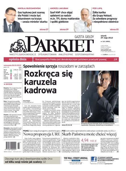 Rozkręca się karuzela kadrowa – spowolnienie sprzyja roszadom w zarządach; minister skarbu, Mikołaj Budzanowski, uważa, że gaz łupkowy jest szansą dla Polski i może być lekarstwem na kryzys; szef KNF chce objąć opłatami za nadzór między innymi TFi, domy maklerskie i spółki giełdowe; żółta kartka dla Grupy Nokaut za odwołane prognozy i niespełnione obietnice; Skarb Państwa może chcieć więcej – jutro walne zgromadzenie zadecyduje o podziale zysku za 2011 rok; dlaczego kurs akcji deweloperskiej spółki Orco od kilku sesji rośnie jak szalony; Enea rozstrzygnęła przetarg na budowę bloku energetycznego w Kozienicach; aby sprostać nowym wymogom kapitałowym, europejskie banki pozbywają się aktywów finansowych, w tym udziałów w firmach zarządzających aktywami.