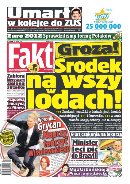 Środek na wszy w lodach – zamiast wanilii w lodach jest środek owadobójczy i barwniki, a smak owoców udają octany lub aldehydy; 9 lat czekania na lekarza – zobacz tabelę hańby polskiej służby zdrowia – ile muszą czekać pacjenci; minister leci pić do Brazylii – to będzie wesoła misja Marka Sawickiego; mąż Urbańskiej zabrania jej posiadania drugiego dziecka, najważniejsza jest praca; Weronika Grycan nauczy tańczyć Michała Wiśniewskiego; rządową limuzyną na fitness – Sławomir Nowak dba o formę przy pomocy szofera; zabiorą kierowcom zieloną strzałkę – kolejny głupi pomysł posłów; umarł w kolejce do ZUS – oto, jak Polacy boją się urzędów.