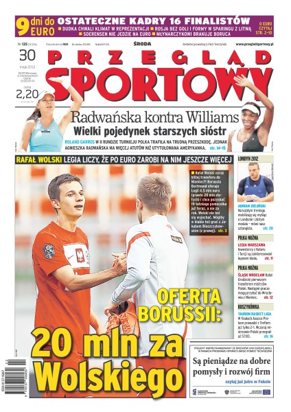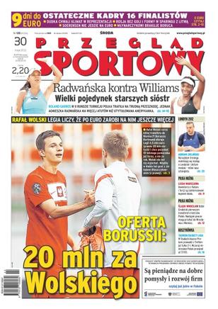 Oferta Borussii Dortmund to 20 milionów za Rafała Wolskiego – Legia liczy, że po Euro zarobi na nim jeszcze więcej; Radwańska konta Williams – wielki pojedynek starszych sióstr – w II rundzie turnieju Roland Garros Polka trafiła na trudną przeszkodę; Adrian Zieliński na każdym treningu mobilizuję się myśląc o Londynie i złotym medalu; inwestorzy z Kataru i Turcji są zainteresowani kupnem Legii Warszawa; Rafał Grodzicki został pierwszym transferem mistrzów Polski, Śląska Wrocław, nastepni gracze mogą przybyć do Wrocławia z Niemiec.