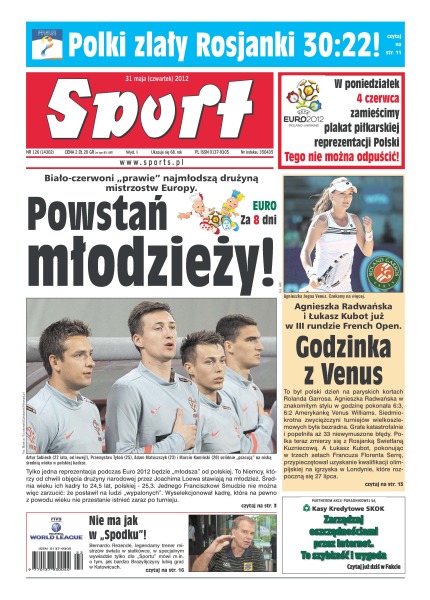 Powstań młodzieży – biało-czerwoni „prawie” najmłodszą drużyną mistrzostw Europy; Polki zlały Rosjanki 30-22; Agnieszka Radwańska i Łukasz Kubot już w III rundzie French Open; Besiktas poza Europą – UEFA wykluczyła na rok klub ze Stambułu z europejskich pucharów oraz ukarała go grzywną 200 tysięcy euro; w nowym sezonie PlusLigi nie będzie żadnego nowego zespołu – zdaniem jej władz najlepsza ekipa I ligi, AZS Stal Nysa, nie spełniła formalnych wymogów; bujanie w obłokach – Fernando Santos uważa, że podczas Euro będzie miał do swojej dyspozycji najlepsza defensywę spośród wszystkich drużyn biorących udział w turnieju.