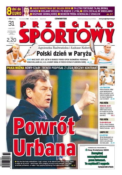 Powrót Urbana – nowy-stary trener podpisał z Legią Warszawa roczny kontrakt; polski dzieńw Paryżu – Agnieszka Radwańska i Łukasz Kubot są już w III rundzie French Open – Isia pokonała Venus Williams, a Kubot ograł w trzech setach Florenta Serrę; Jakub Wawrzyniak nie składa broni; Rosjanie wściekli po remisie z Litwą; Czesi zostają we Wrocławiu; Niemców próba generalna z Izraelem; Andrea Anastasi, odkąd został selekcjonerem biało-czerwonych, w katowickim Spodku jeszcze nie wygrał; do gry ze Śląskiem Wrocław o Piotra Celebana włączyło się holenderskie Twente Enschede; 19-letni Fortounis tajną bronią Greków.
