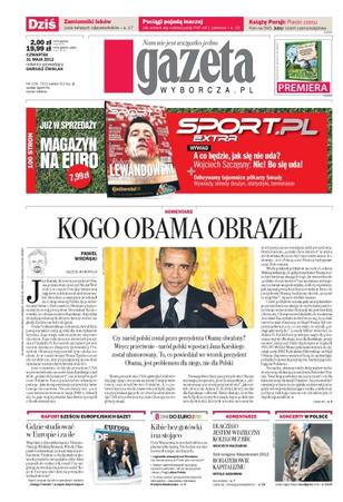 Kogo Obama obraził – naród polski w postaci Jana Karskiego został uhonorowany – to, co powiedział we wtorek prezydent Obama, jest problemem dla niego, nie dla Polski; zamienniki leków – lista tańszych zamienników; pociągi pojadą inaczej – jak zmieni się rozkład jazdy PKP od 1 czerwca; gdzie studiować w Europie i za ile; kibic bez gotówki i na stojąco – poza Warszawą w strefach kibica zapłacisz tylko kartą, nie będzie też darmowych miejsc siedzących; legionella straszyła we Wrocławiu – czy Czesi przylecą do Polski tylko na mecze; bohaterowie kapitalizmu – dziś kongres Niepokonani 2012; gdzie zagra Slayer i inni.