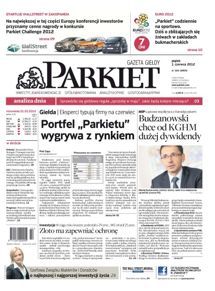 Portfel „Parkietu” wygrywa z rynkiem – eksperci typują firmy na czerwiec; złoto ma zapewniać ochronę – w ciągu roku kruszec podrożał o 29 procent, WIG stracił 25 procent; szefowa Związku Maklerów i Doradców o najlepszej i najgorszej inwestycji życia; startuje Wallstreet w Zakopanem – na największej w tej części Europy konferencji inwestorów przyznamy cenne nagrody w konkursie Parkiet Challenge 2012; minister Budzanowski chce od KGHM dużej dywidendy; debiuty – rumuńskie firmy Romgaz i Transgaz oraz trzy z branży energetycznej chcą wejść na GPW w ramach podwójnych notowań; Ministerstwo Skarbu Państwa uważa, że lider polskiego rynku cukru, KSC, powinien stać się spółką giełdową, kontrolowaną przez plantatorów i załogę; nasza gospodarka rosła w I kwartale najwolniej od dwóch lat – zaskoczył spadek dynamiki inwestycji i słaby wzrost konsumpcji prywatnej.