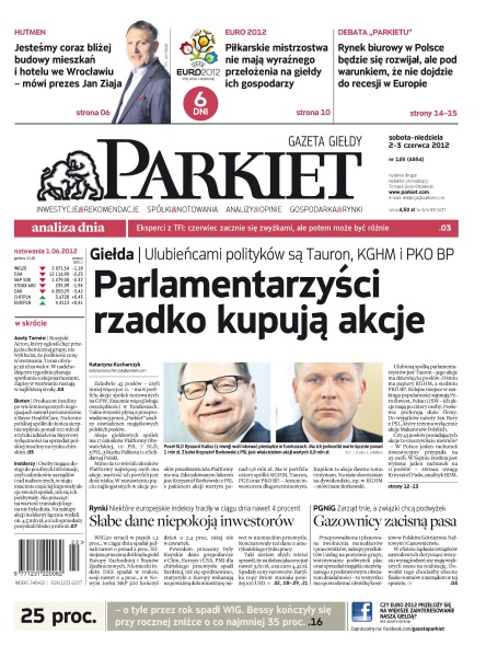 Parlamentarzyści rzadko kupują akcje – ale ulubieńcami polityków są Tauron, KGHM i PKO BP; jesteśmy coraz bliżej budowy mieszkań i hotelu we Wrocławiu – mówi prezes Jan Ziaja; piłkarskie mistrzostwa nie mają wyraźnego przełożenia na giełdy ich gospodarzy; rynek biurowy w Polsce będzie się rozwijał, ale pod warunkiem, że nie dojdzie do recesji w Europie; niektóre europejskie indeksy traciły w ciągu dnia nawet 4 procent.