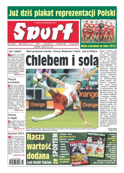 Chlebem i solą – nasi grupowi rywale – Grecy, Rosjanie i Czesi – już w Polsce; Franciszek Smuda po meczu z Andorą przyznał, że ostateczny skład będzie bardzo zbliżony do tego sobotniego; zmiana w Anglii – Gary Cahill, który złamał szczękę po meczu Anglii z Belgią, nie zagra na Euro – zastąpi go Martin Kelly z Liverpoolu; włoski trener Andrea Anastasi będzie pracował z reprezentacją polskich siatkarzy przez kolejne dwa lata; nie ma jak u siebie – Boston Celtic pokonali we własnej hali Miami Heat i w rywalizacji do czterech zwycięstw przegrywają już tylko 1-2; Hart Wawrzyka, fart Szpilki – przyszłość polskiej wagi ciężkiej rysuje się obiecująco, ale po gali w Bydgoszczy pojawiło się też trochę wątpliwości.