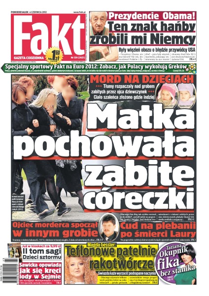Matka pochowała zabite córeczki – ojciec morderca spoczął w innym grobie; „Prezydencie Obama, ten znak hańby zrobili mi Niemcy” – były więzień obozu o błędzie przywódcy USA; Sawicka opowiada jak się kręci lody w Sejmie; Tatiana Okupnik fika bez stanika; „Teflonowe patelnie są rakotwórcze” – Magda Gessler, gwiazda każe wyrzucić podrapane naczynia; specjalny sportowy Fakt na Euro 2012 – zobacz jak Polacy wykołują Greków; cud na plebanii po śmierci Laury – na pogrzebie zabitej dziewczynki ksiądz ujawnił niezwykłe zdarzenie.