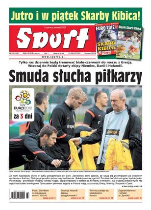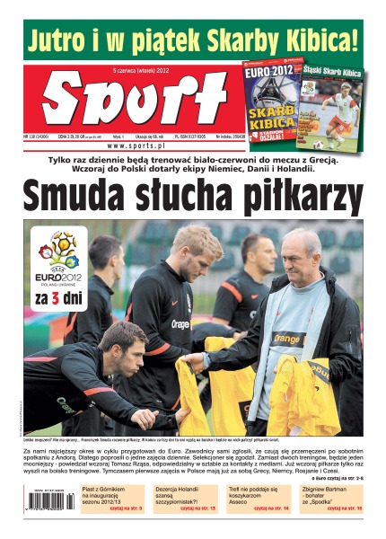 Smuda słucha piłkarzy – tylko raz dziennie będą trenować biało-czerwoni do meczu z Grecją – wczoraj do Polski dotarły ekipy Niemiec, Danii i Holandii; Piast z Górnikiem na inaugurację sezonu 2012/13; dezercja Holandii szansą szczypiornistek; Trefl nie poddaje się koszykarzom Asseco; Zbigniew Bartman – bohater ze „Spodka”; GKS Bełchatów rozwiązał kontrakty z trzema najbardziej doświadczonymi zawodnikami – Grzegorzem Fonfarą, Łukaszem Sapelą oraz Jackiem Popkiem.