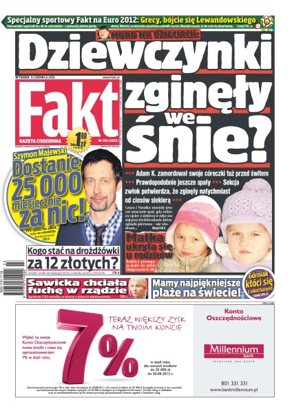 Mord na dzieciach – czy dziewczynki zginęły we śnie; Szymon Majewski dostanie 25 tysięcy złotych miesięcznie za nic – TVN będzie mu płacił, żeby nie odszedł do konkurencji; Edyta Górniak kłóci się z ukochanym; mamy najpiękniejsze plaże na świecie; Sawicka chciała fuchę w rządzie – agentom CBA mówiła, że marzy o pracy w ministerstwie; kogo stać na drożdżówki za 12 złotych – zwykłe matki demaskują blichtr i obłudę matek celebrytek; Grecy, bójcie się Lewandowskiego – fenomenalny napastnik jest nie do zatrzymania, z pewnością pokona grecką obronę – niestety na wizerunku naszej kadry pojawiły się rysy, Obraniak oskarża, że nie czuje się akceptowany.