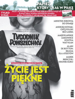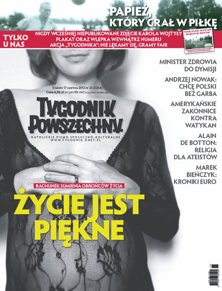 Dodatek: plakat z niepublikowanym dotąd zdjęciem grającego w piłkę Karola Wojtyły i wlepka akcji „Tygodnika”.