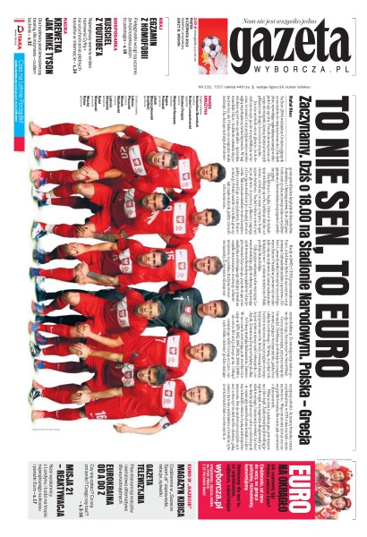 To nie sen, to Euro – zaczynamy, dziś o 18 na Stadionie Narodowym meczem Polska - Grecja; egzamin z homofobii – pielęgniarki wciąż są uczone, że homoseksualizm to patologia; kusiciel z Youtube'a – największy serwis wideo namawia Cyfrę+ na uruchomienie płatnych kanałów w internecie; krewetka jak Mike Tyson – dla hodowcy jest krwiożerczą bestią, dla inżyniera – cudem techniki; gazeta telewizyjna – plan transmisji meczów i serialowa alternatywa dla euroobojętnych; eurokraina od A do Z – czy się opłaci, co się zmieniło, czego się bać; Misia 21 - reaktywacja – nasi wysłannicy z Londynu i Łodzi na tropie największego sukcesu i porażki Euro; Euro na okrągło – jak naprawdę żyje Polska podczas Euro.