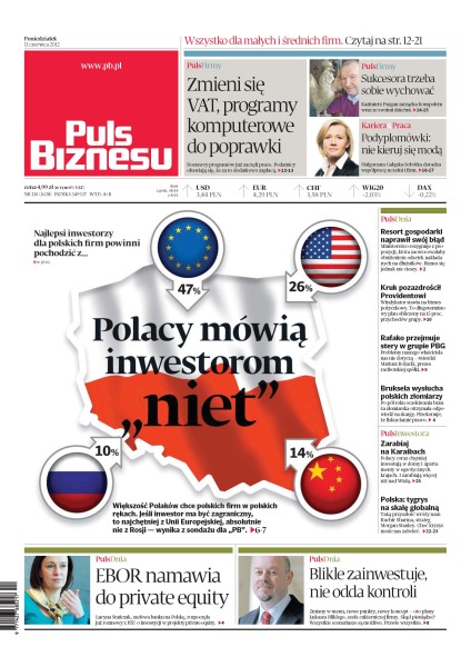 Kazimierz Pazgan zarządza Konspolem wraz ze swoimi dziećmi; Małgorzata Gałązka-Sobótka doradza współpracę uczelni i firm; Kruk pozazdrościł Providentowi; Rafako przejmuje stery w grupie PBG; Bruksela wysłucha polskich złomiarzy; Polacy coraz chętniej inwestują w domy i apartamenty w egzotycznych krajach; większość Polaków chce polskich firm w polskich rękach – jeśli inwestor ma być zagraniczny, to najchętniej z Unii Europejskiej, absolutnie nie z Rosji; Lucyna Stańczak, szefowa banku na Polskę, rozpoczęła już rozmowy z PZU o inwestycji w projekty private equity.
