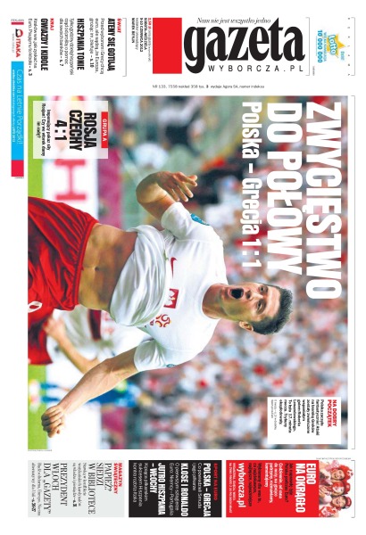 Przemysław Tytoń i Robert Lewandowski zostali bohaterami meczu otwarcia, w którym Polacy zremisowali z Grekami 1:1; Rosja pokonała Czechy 4:1; rosyjscy kibice i warszawscy urzędnicy rozmawiają o marszu przed meczem z Polską na Euro 2012; to już pewne, że Madryt nie poradzi sobie bez pomocy eurolandu w ratowaniu hiszpańskich banków; totalitaryzm nie jest wieczny, a my będziemy robili swoje tak długo, jak to będzie potrzebne – mówi minister tybetańskiego rządu na uchodźstwie.
