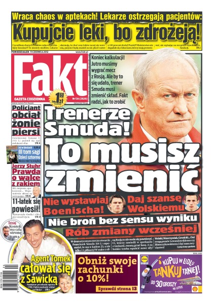 Czy wrócą kolejki i chaos w aptekach; przez rok wzrosły pensje wielu prezydentów i burmistrzów polskich miast; agent Tomek całował się z Sawicką; nowy taryfikator mandatów; nowe szokujące szczegóły tragedii na Śląsku!; na pniu starej lipy w Międzyrzeczu pojawił się nagle wizerunek Maryi; wzruszające wyznania Jerzego Stuhra; Madonna pokazała fanom nagą pierś na koncercie w Stambule; Rubik kontra Krupa.