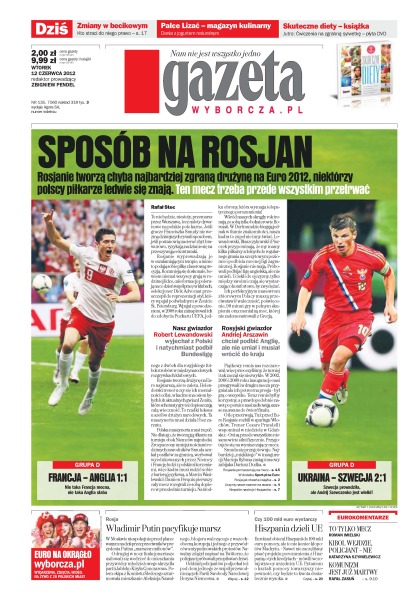 Rosjanie tworzą chyba najbardziej zgraną drużynę na Euro 2012, niektórzy polscy piłkarze ledwie się znają – Ten mecz trzeba przede wszystkim przetrwać; czy Kamiński odpowie za aferę gruntową; w Moskwie niespokojnie przed zapowiedzianym na dziś „marszem milionów” – władze, próbując spacyfikować przeciwników Putina, przeprowadziły wczoraj rano rewizje w domach opozycjonistów; dlaczego przywileje nauczycieli są często obiektem zazdrości; od stycznia 2013r. zmienią się zasady przyznawania becikowego; łódzka studentka stworzyła biżuterię, którą można składać jak klocki; Euroland obiecał Hiszpanii do 100 mld euro pomocy, ale to nie koniec kłopotów Madrytu; w najbliższych dniach Chiny mają wysłać na orbitę pierwszą załogę do swej pierwszej stacji kosmicznej.