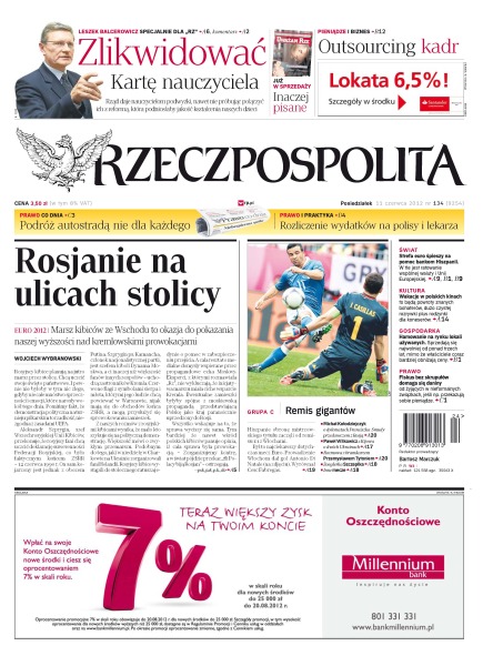 Rząd daje nauczycielom podwyżki, nawet nie próbując połączyć ich z reformą, która podniosłaby jakość kształcenia naszych dzieci; marsz kibiców ze Wschodu to okazja do pokazania naszej wyższości nad kremlowskimi prowokacjami; kibice szturmują Muzeum Powstania Warszawskiego i Muzeum Narodowe w Poznaniu; UEFA wszczęła postępowanie w sprawie burdy i rasistowskiego zachowania kibiców ze Wschodu; strefa euro śpieszy na ratunek kolejnemu krajowi; pojednawczy gest prezydenta RFN wywołał niezwykle pozytywne reakcje czeskich polityków; spektakl „Popiełuszko” w Bydgoszczy to trudny egzamin z wolności; Maria Szarapowa pierwszy raz wygrała w Paryżu.