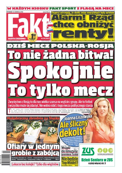 Zwycięstwo z Rosją to dla nas wielka szansa na wyjście z grupy, ale to futbol i wszystko może się zdarzyć – nie wolno robić z tego meczu politycznego starcia; limuzyna Donalda Tuska to samochód wykonany na specjalne zamówienie; dlaczego zwykły Polak na wizytę do specjalisty czeka kilka miesięcy, a bandyta dwa tygodnie; jak naciągaczka podszyła się pod córkę emerytki i chciała wyłudzić od niej 15 tys. zł; Monika Richardson pracuje nad wyglądem partnera; trener Franciszek Smuda postanowił zostawić w składzie na dzisiejszy mecz Sebastiana Boenischa, choć ten w meczu z Grecją był najsłabszy na boisku; „Projekt X” to komedia, którą w niedzielę wieczorem oglądała połowa naszych reprezentacyjnych piłkarzy; bramkarz reprezentacji Polski Przemysław Tytoń od nowego sezonu będzie grał w drużynie, którą poprowadzi Dick Advocaat – obecny trener Rosjan.