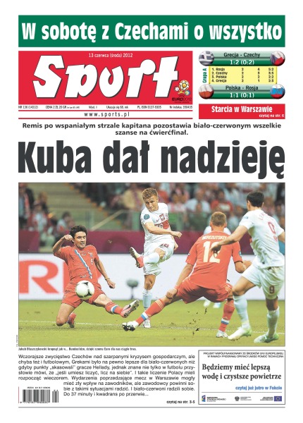 Remis z Rosją po wspaniałym strzale kapitana pozostawia biało-czerwonym wszelkie szanse na ćwierćfinał; to był trudny dzień dla Warszawy – w mieście kilka razy doszło do starć między Polakami a Rosjanami; fatalny kiks bramkarza Petra Czecha nie pozbawił drużyny Michala Bilka zwycięstwa w meczu z Grecją; czy Holendrzy po dzisiejszym meczu będą mogli pakować walizki; Andrij Szewczenko, na przekór niedowiarkom, pozwolił w poniedziałkowy wieczór oszaleć całej Ukrainie; polskie sprinterki wygrały bieg 4x100 m podczas 19. Memoriału Josefa Odlozila w Pradze; Jarosław Hampel est już po operacji nogi – czeka go teraz minimum dwa miesiące przerwy; na co skarżą się piłkarze podczas Euro 2012.