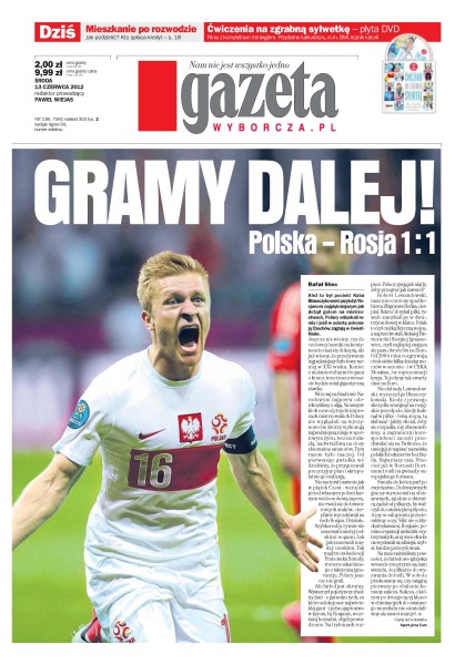 Kuba Błaszczykowski przyłożył Rosjanom najpiękniejszym jak dotąd golem na mistrzostwach, Polacy odzyskali remis i jeśli w sobotę pokonają Czechów, zagrają w ćwierćfinale; marsz rosyjskich kibiców – wbrew nadziejom – nie przeszedł w spokoju; polskie wojsko chce kupić w najbliższych latach kilkadziesiąt bezzałogowych samolotów szpiegowskich – takich jak izraelski Heron; czy pozostawanie grupy Władimira Putina przy władzy jest śmiertelnie niebezpieczne dla kraju; bezpieczne wakacje, czyli jak nie dać się biegunce innym chorobom; jak się podzielić mieszkaniem lokatorskim, a jak własnościowym; nasi przedsiębiorcy nie chcą przejmować innych firm, nie chcą inwestować za granicą i częściej niż do tej pory myślą o sprzedaniu swoich firm; kryzys zalewa Europę, więc pogoda do inwestowania w fundusze jest bardzo zmienna i niepewna.