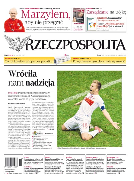 Po pełnym emocji meczu Polacy zremisowali z Rosją 1:1 – nasza reprezentacja ma realne szanse na grę w ćwierćfinale; starcia nielicznych grup chuliganów nie zakłóciły sportowego widowiska na meczu Polska – Rosja; Bronisław Komorowski wprowadza więcej jednomandatowych okręgów wyborczych w samorządach; czy prywatne szpitale tak selekcjonują chorych, by ich leczenie było opłacalne; w Rosji opozycja przetrwała próbę, ale na razie nadal niewiele ma do zaoferowania zwykłym ludziom; Damien Hirst, wielki prowokator sztuki współczesnej, doczekał się wystawy w Tate Modern; Andrij Szewczenko – Ukraina znów go potrzebuje, a on marzy o wielkiej przygodzie na zakończenie kariery; rząd proponuje, by minimalne wynagrodzenie wzrosło w przyszłym roku do 1600 zł.