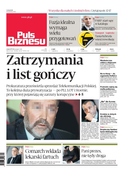 Eksperci radzą, jak przeprowadzić udane połączenie przedsiębiorstw; „Auto do floty” to tym razem toyota yaris hybrid; prokuratura prześwietla sprzedaż Telekomunikacji Polskiej – to kolejna duża prywatyzacja – po PLL LOT i Stoenie, przy której pojawiają się zarzuty korupcyjne; projekt Solidarnej Polski, który miał uwolnić branżę od podatkowych kłopotów, trafi do kosza; giełdowy producent coli chce wyprzedzić produkt Pepsi i na dobre rozgościć się w hotelach oraz restauracjach; skarb państwa, główny akcjonariusz Tarnowa, nie odpowie na wezwanie Rosjan i spodziewa się kontrwezwania na chemiczną firmę; inflacja słabnie, więc Rada Polityki Pieniężnej nie powinna podnosić stóp; ostatnie upadłości firm budowlanych spowodowały, że zamiast pewnego zysku klienci funduszy mają straty.