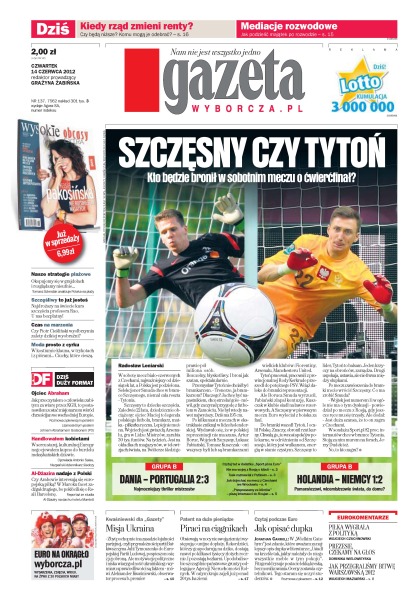 Szczęsny czy Tytoń – kto będzie bronił w sobotnim meczu o ćwierćfinał; z biletem na mecz Polski z Czechami autobusy i tramwaje będą we Wrocławiu darmowe; toczy się batalia o miejsce Ukrainy w świecie; im większy majątek zgromadzili rozwodzący się małżonkowie, tym większe emocje przy jego podziale – ratunkiem dla zwaśnionych stron może być mediator; podwyższając wiek emerytalny do 67 lat, rząd zmienił zapisy dotyczące rent – jak będzie wyliczana renta, kto straci, a kto zyska do niej prawo; naukowcom udało się odczytać genom najbardziej rozwiązłej małpy świata; czy po wtorkowych burdach kibicowanie podczas Euro 2012 w Warszawie jest jeszcze bezpieczne.