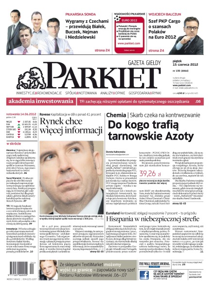 45 zł za akcje Azotów Tarnów zachęci do ich odsprzedaży; Wiśniewski przejmuje stery w Redanie; instytucje inwestycyjne intensywnie promują ostatnio różne sposoby odkładania pieniędzy na starość – systematyczne oszczędzanie nie musi się jednak wiązać z emeryturą; firmy leasingowe redukują tegoroczne prognozy; w tym roku wartość polskich inwestycji zagranicznych może przekroczyć 5,5 mld USD; rentowność hiszpańskich obligacji dziesięcioletnich dotknęła „alarmowego” poziomu 7 proc. – żaden kraj peryferii strefy euro nie wytrzymał tak wysokich kosztów finansowania dłużej niż pół roku.
