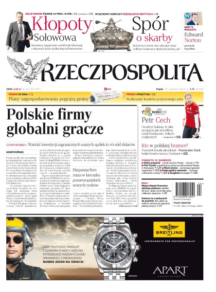 Wartość inwestycji zagranicznych naszych spółek to 44 mld dolarów; bez względu na wynik spotkania Polska – Czechy kibice obu drużyn pójdą razem na piwo; Kościół we Lwowie próbuje odzyskać słynny obraz i cenne relikwie – krakowscy duchowni twierdzą, że w Polsce będą bezpieczniejsze; nie udało się wyłonić autorów połowy cyfrowych książek dla uczniów; wybory w Grecji mogą oznaczać wyjście tego kraju ze strefy euro; wydano właśnie zestaw najatrakcyjniejszych tytułów ubiegłorocznego festiwalu T-Mobile Nowe Horyzonty; Tomasz Adamek o sobotniej walce z Eddie Chambersem i o tym, że choć waży dużo, szybkości nie stracił; Franciszek Smuda zdecydował: będzie bronił Przemysław Tytoń.
