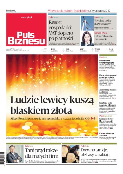 Farmy wiatrowe mają już dedykowane ubezpieczenie; właściciel firmy obuwniczej Kazar chętnie mówi o przejęciach – nie kryje też, że kiedyś sprzeda firmę; już na początku 2014 r. za przejazd A2 do niemieckiej granicy zapłacimy 80 zł, a A1 nad morze około 45 zł; Silver Bonds jeszcze nic nie sprzedała, a już zaniepokoiła KNF; Kaufland idzie na wojnę z Danone; różnica w cenie sztabki o takiej samej zawartości złota i wadze może wynieść nawet 9 proc., dlatego warto wiedzieć, gdzie kupować; w 2011 r. Lasy Państwowe zarobiły aż 830 mln zł. – cieszyć powinni się także odbiorcy ponieważ drewno jest coraz tańsze, a system sprzedaży ma zostać zreformowany.