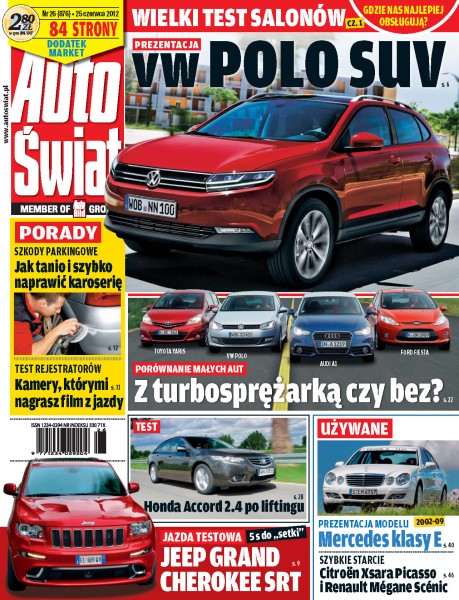 Jak tanio i szybko naprawić karoserię; test kamer, którymi można nagrać film z jazdy; które salony samochodowe najlepiej obsługują klientów; Jeep Grand Cherokee SRT; porównanie małych aut z silnikami benzynowymi: Audi A1, Ford Fiesta, Toyota Yaris, Volkswagen Polo,; Honda Accord - japońska limuzyna w wersji 2.4; Chevrolet Sonic - amerykańska wersja Aveo.